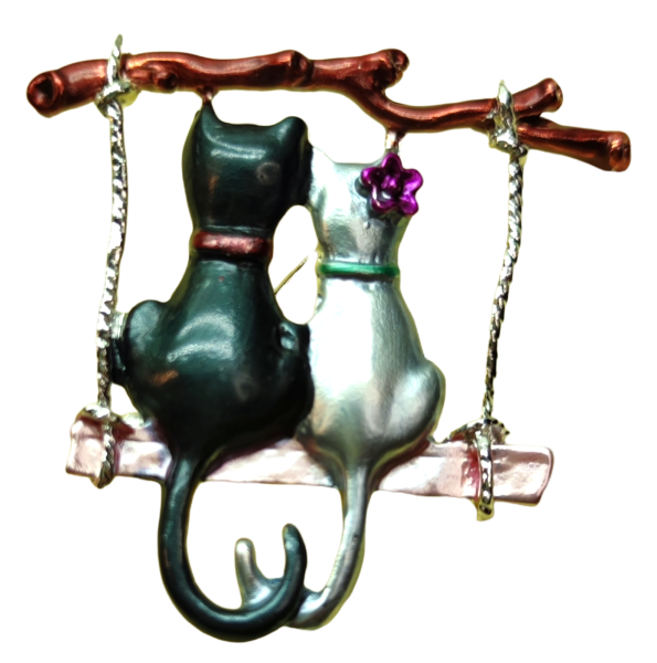 Wunderhübsche stabile Metall Brosche mit zwei Katzen die auf einer Schaukel sitzen und den Sonnenuntergang betrachten, sie ist sowohl als Brosche als auch als Anhänger zu tragen.